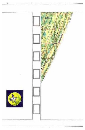 Konzeption für die Giebelwände eines Gebäude-Ensembles. Mondlandschaft/Karte als Sequenz mit jeweils gegenüber gestelltem Symbol und konkreter Angabe des jeweiligen Mondausschnitts (kleines Kästchen im ganzen Mond). Realisiert in der Charlottenstraße 17 c, d, e, Berlin-Köpenick 2002.